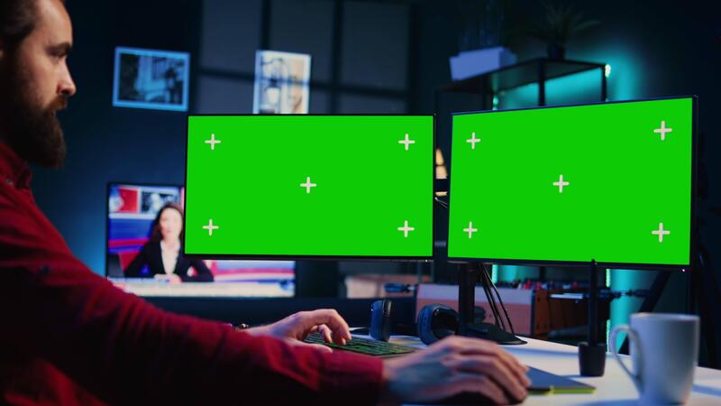 Photographer uses photo editing software on chroma key PC display in personal studio. Freelancer uses photographs retouching program on isolated screen multi monitor computer setup Pro Video