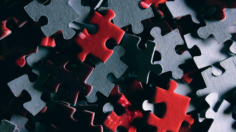 Background of Colored Puzzle Pieces that Slowly Rotating Counterclockwise Top View, CloseUp. Texture of Incomplete Red and Grey Jigsaw Puzzle with Low Key Light Left Rotation Pro Video