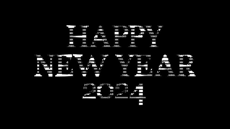 Happy New Year 2024 ascii animation on black background. Ascii art code symbols with shining and glittering sparkles effect backdrop. Attractive attention promo. Pro Video