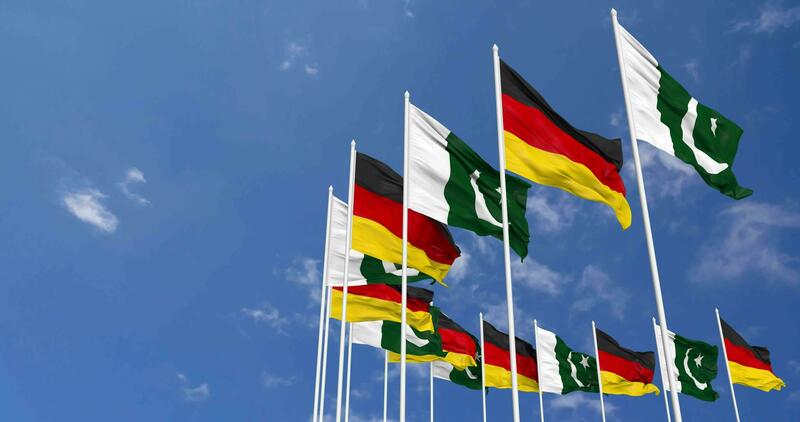 Pakistan and Germany Flags Waving Together in the Sky, Seamless Loop in Wind, Space on Left Side for Design or Information, 3D Rendering Free Video