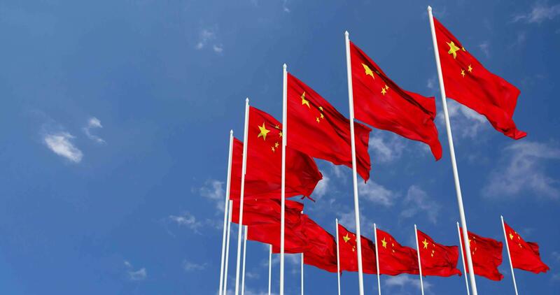China Flags Waving in the Sky, Seamless Loop in Wind, Space on Left Side for Design or Information, 3D Rendering Free Video