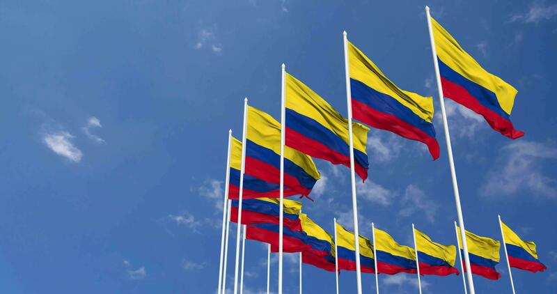 Colombia Flags Waving in the Sky, Seamless Loop in Wind, Space on Left Side for Design or Information, 3D Rendering Free Video