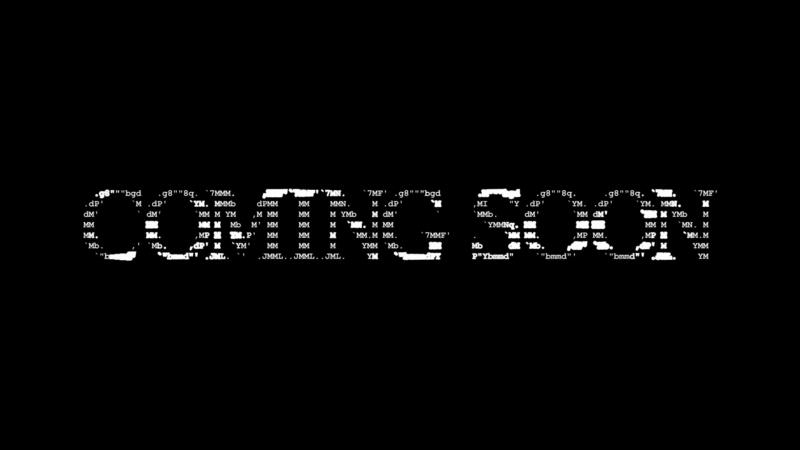 Coming soon ascii animation on black background. Ascii art code symbols with shining and glittering sparkles effect backdrop. Attractive attention promo. Pro Video