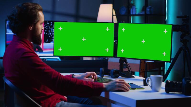 Photographer using photo editing software on Chroma key multi monitors setup to improve images quality. Photo editor utilizing pictures retouching application on green screen display Pro Video