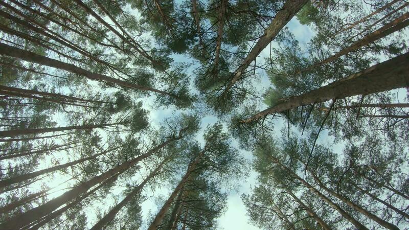 Low Angle View of a Pine Forest when Looking Up to the Trees. Bottom View of Pine Crowns at Sunny Summer Day. The Sky Can Be Seen Through the Tops of the Trees. Backward Gimbal Stabilizer Movement Pro Video