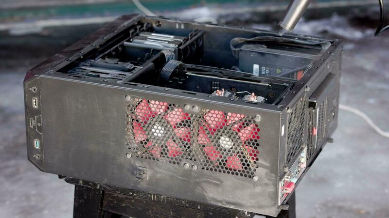 dust blowing of black atx persolnal computer case, closeup with slow motion