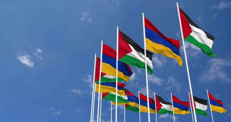 Armenia and Palestine Flags Waving Together in the Sky, Seamless Loop in Wind, Space on Left Side for Design or Information, 3D Rendering Free Video