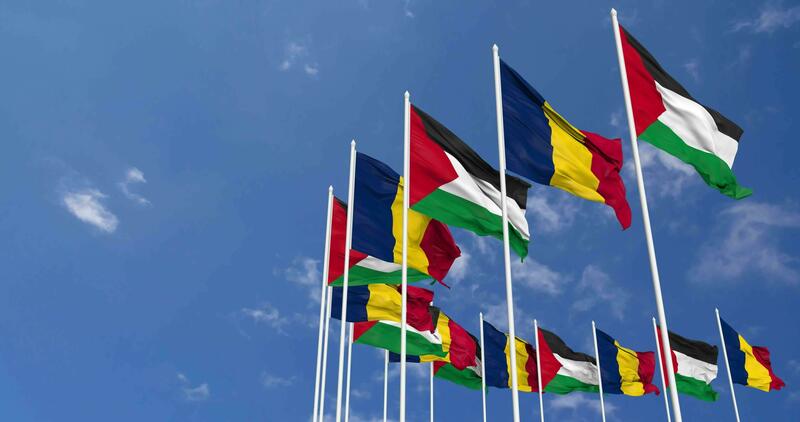 Chad and Palestine Flags Waving Together in the Sky, Seamless Loop in Wind, Space on Left Side for Design or Information, 3D Rendering Free Video