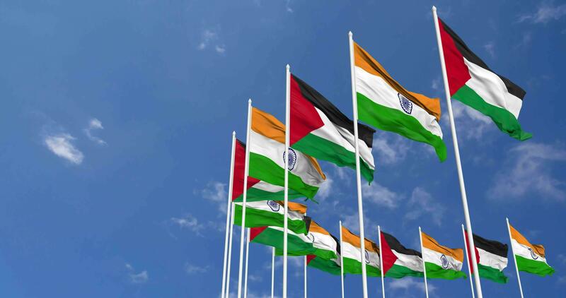 India and Palestine Flags Waving Together in the Sky, Seamless Loop in Wind, Space on Left Side for Design or Information, 3D Rendering Free Video