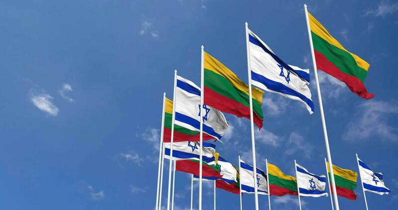 Lithuania and Israel Flags Waving Together in the Sky, Seamless Loop in Wind, Space on Left Side for Design or Information, 3D Rendering Free Video
