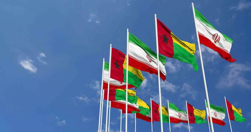 Guinea Bissau and Iran Flags Waving Together in the Sky, Seamless Loop in Wind, Space on Left Side for Design or Information, 3D Rendering Free Video