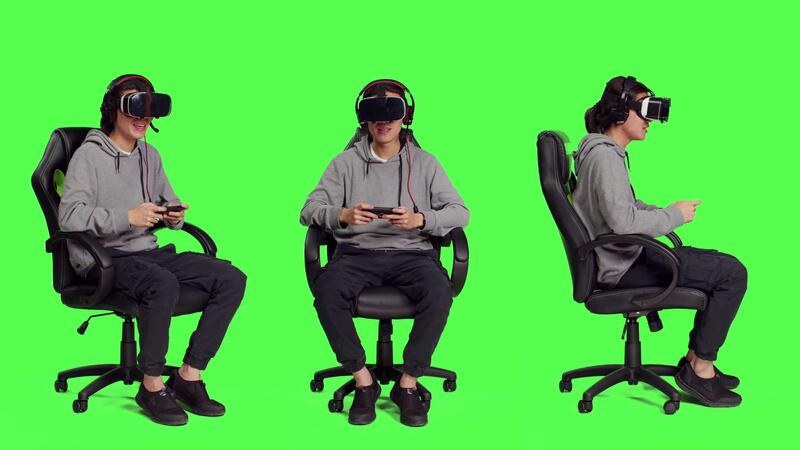 Person rests on chair over greenscreen backdrop and performs video games using virtual reality eyewear and mobile device, takes part in online multiplayer contest. Asian guy loving combat games. Pro Video