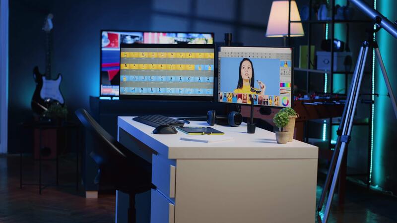 Media company creative office with multi monitors setup used for post processing retouching of images. Editing software interface on computer screens in professional graphic design workspace Pro Video