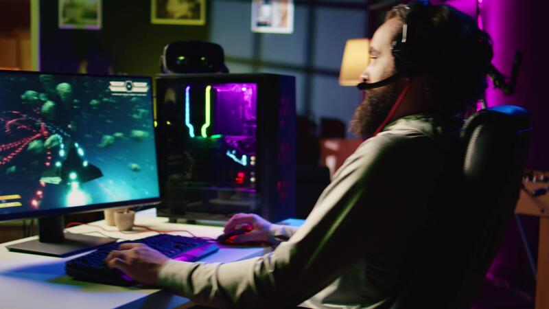 Man at home playing singleplayer videogame with spaceship shooting laser beams at asteroids, panning shot. Pro gamer destroying enemies in science fiction game using gaming mouse Pro Video