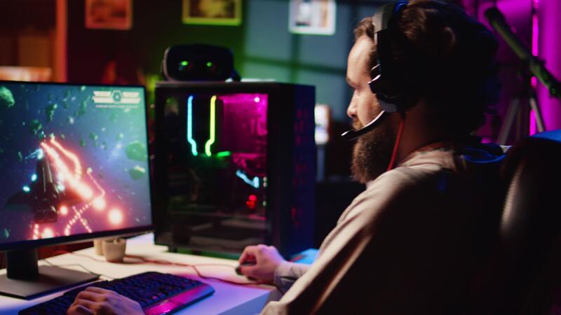 Man broadcasting gaming session online, talking with viewers while destroying enemies to finish level in flying game, panning shot. Gamer live streaming science fiction videogame, chatting with fans Pro Video