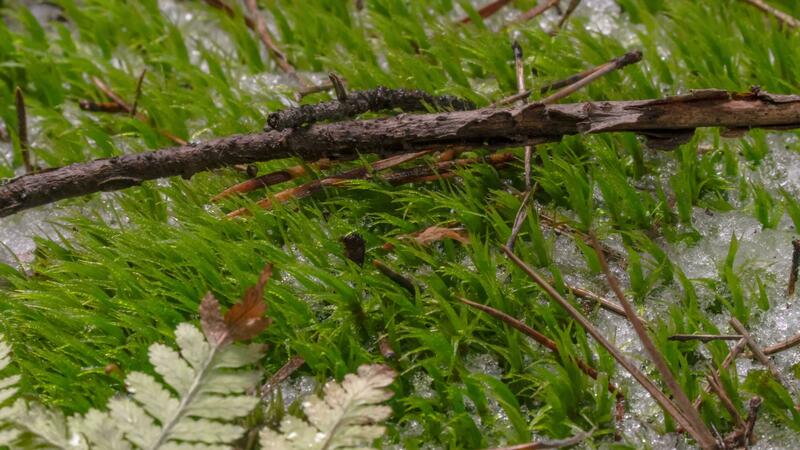 Macro time-lapse shot of shiny particles of melting snow and open green grass, branch and leaves. Change of season from winter to spring in the forest. Pro Video
