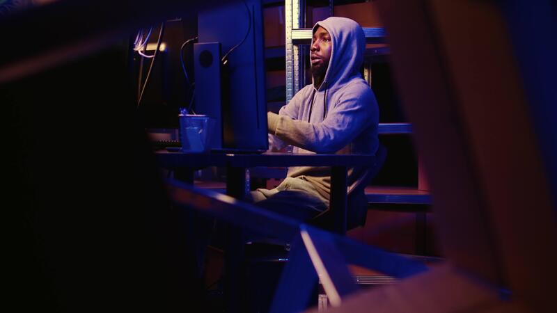 Jib up shot of hackers creating pirating crack for software and video game releases, getting past anti tamper measures implemented by companies trying to protect their products Pro Video