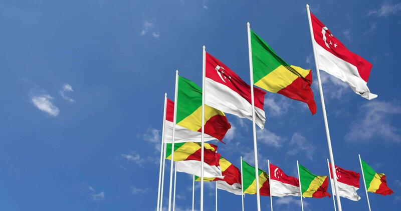 Congo and Singapore Flags Waving Together in the Sky, Seamless Loop in Wind, Space on Left Side for Design or Information, 3D Rendering