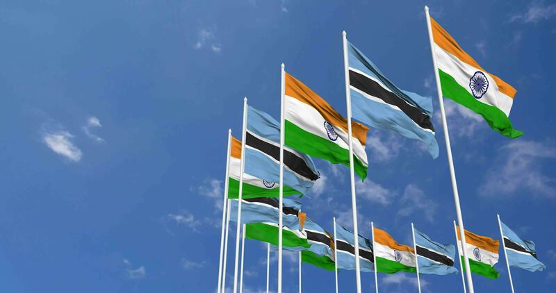 Botswana and India Flags Waving Together in the Sky, Seamless Loop in Wind, Space on Left Side for Design or Information, 3D Rendering Free Video