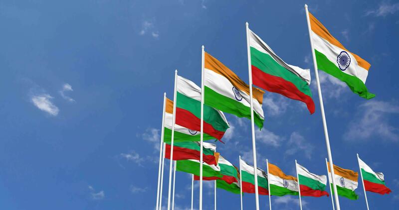Bulgaria and India Flags Waving Together in the Sky, Seamless Loop in Wind, Space on Left Side for Design or Information, 3D Rendering Free Video