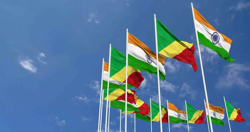 Congo and India Flags Waving Together in the Sky, Seamless Loop in Wind, Space on Left Side for Design or Information, 3D Rendering Free Video