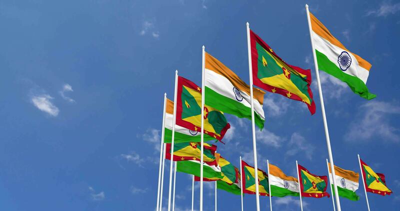 Grenada and India Flags Waving Together in the Sky, Seamless Loop in Wind, Space on Left Side for Design or Information, 3D Rendering Free Video