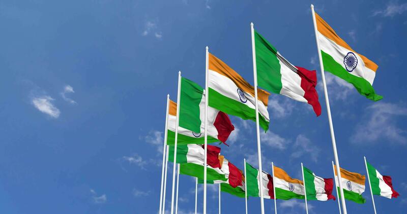 Italy and India Flags Waving Together in the Sky, Seamless Loop in Wind, Space on Left Side for Design or Information, 3D Rendering Free Video