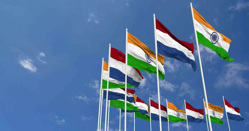 Netherlands and India Flags Waving Together in the Sky, Seamless Loop in Wind, Space on Left Side for Design or Information, 3D Rendering Free Video