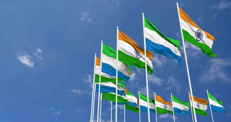 Sierra Leone and India Flag Waving Together in the Sky, Seamless Loop in Wind, Space on Left Side for Design or Information, 3D Rendering Free Video