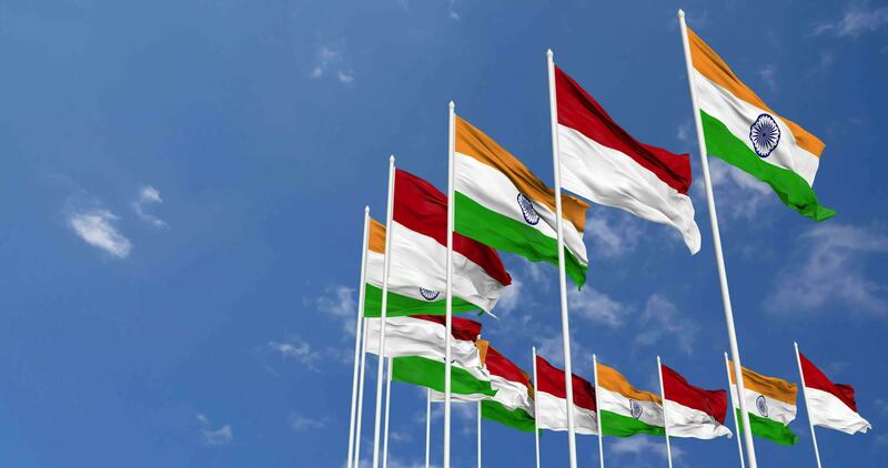 Monaco and India Flags Waving Together in the Sky, Seamless Loop in Wind, Space on Left Side for Design or Information, 3D Rendering Free Video