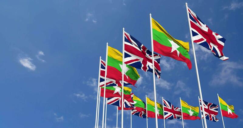 Myanmar, Burma and United Kingdom Flags Waving Together in the Sky, Seamless Loop in Wind, Space on Left Side for Design or Information, 3D Rendering Free Video