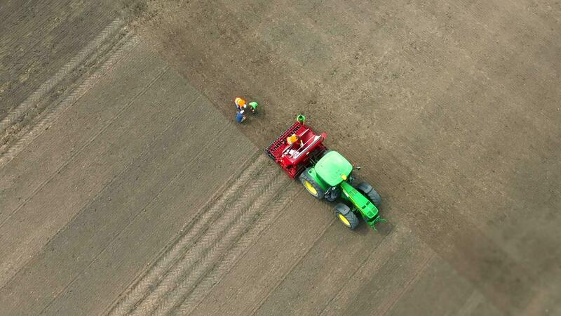 Aerial View of Tractor with Seeder in Field. Top-down view of a tractor with a seeder attachment preparing the field for planting. Pro Video