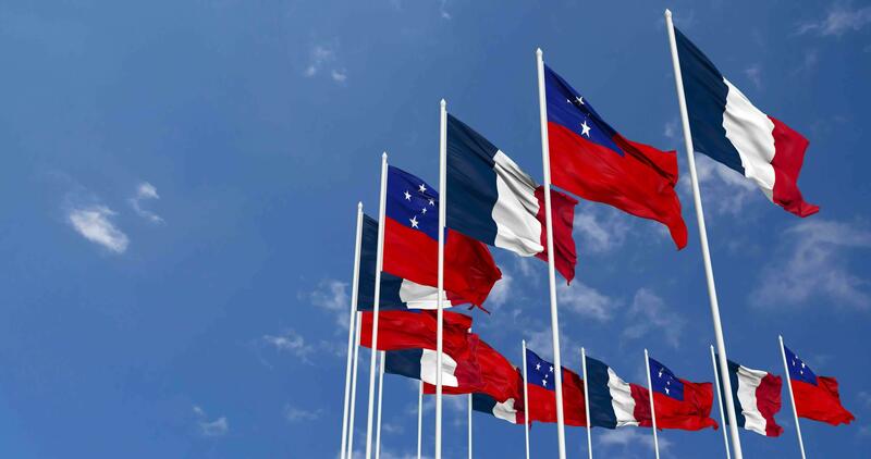Samoa and France Flags Waving Together in the Sky, Seamless Loop in Wind, Space on Left Side for Design or Information, 3D Rendering Free Video