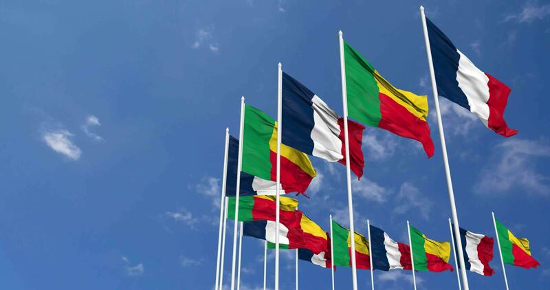 Benin and France Flags Waving Together in the Sky, Seamless Loop in Wind, Space on Left Side for Design or Information, 3D Rendering Free Video