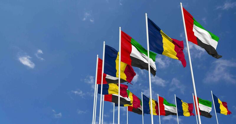 Chad and United Arab Emirates, UAE Flags Waving Together in the Sky, Seamless Loop in Wind, Space on Left Side for Design or Information, 3D Rendering Free Video