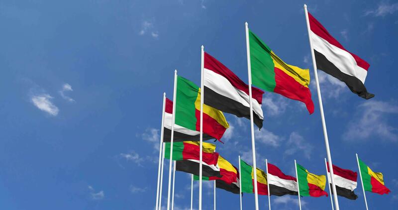 Benin and Yemen Flags Waving Together in the Sky, Seamless Loop in Wind, Space on Left Side for Design or Information, 3D Rendering Free Video