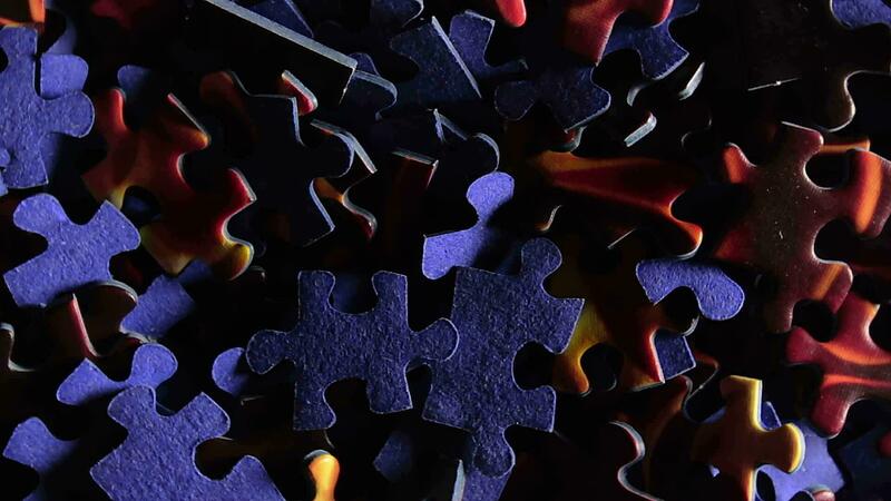 Background of Colored Puzzle Pieces that Slowly Rotating Counterclockwise - Top View, Close-Up. Texture of Incomplete Red and Blue Jigsaw Puzzle with Low Key Light - Left Rotation Free Video