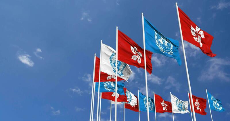 Hong Kong and United Nations, UN Flags Waving Together in the Sky, Seamless Loop in Wind, Space on Left Side for Design or Information, 3D Rendering