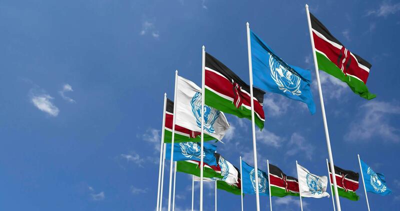 Kenya and United Nations, UN Flags Waving Together in the Sky, Seamless Loop in Wind, Space on Left Side for Design or Information, 3D Rendering