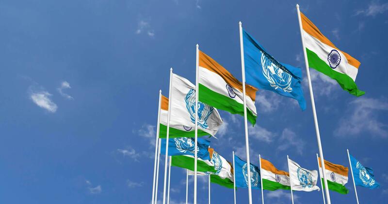 India and United Nations, UN Flags Waving Together in the Sky, Seamless Loop in Wind, Space on Left Side for Design or Information, 3D Rendering