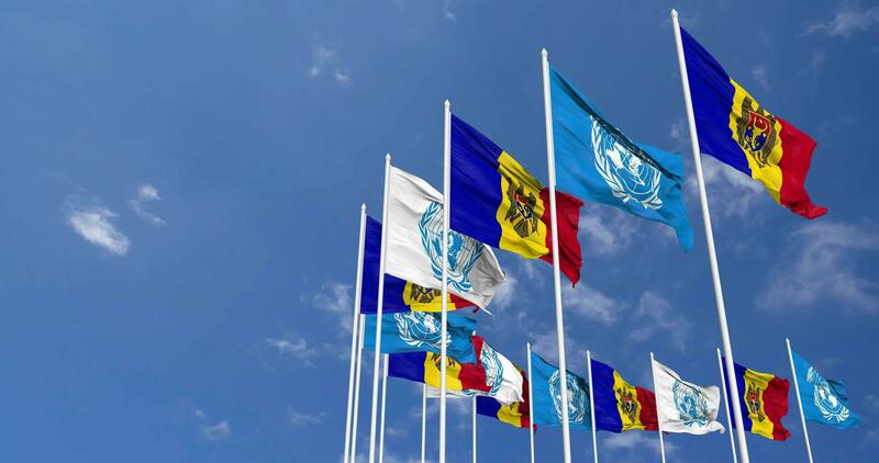 Moldova and United Nations, UN Flags Waving Together in the Sky, Seamless Loop in Wind, Space on Left Side for Design or Information, 3D Rendering