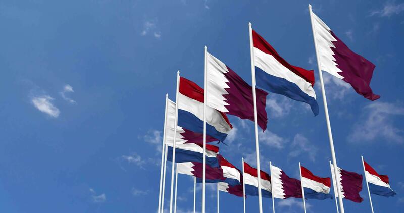 Netherlands and Qatar Flags Waving Together in the Sky, Seamless Loop in Wind, Space on Left Side for Design or Information, 3D Rendering Free Video