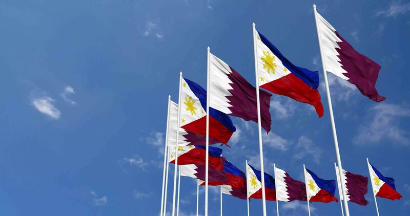 Philippines and Qatar Flags Waving Together in the Sky, Seamless Loop in Wind, Space on Left Side for Design or Information, 3D Rendering Free Video