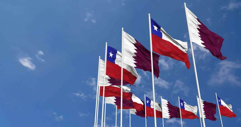 Chile and Qatar Flags Waving Together in the Sky, Seamless Loop in Wind, Space on Left Side for Design or Information, 3D Rendering Free Video