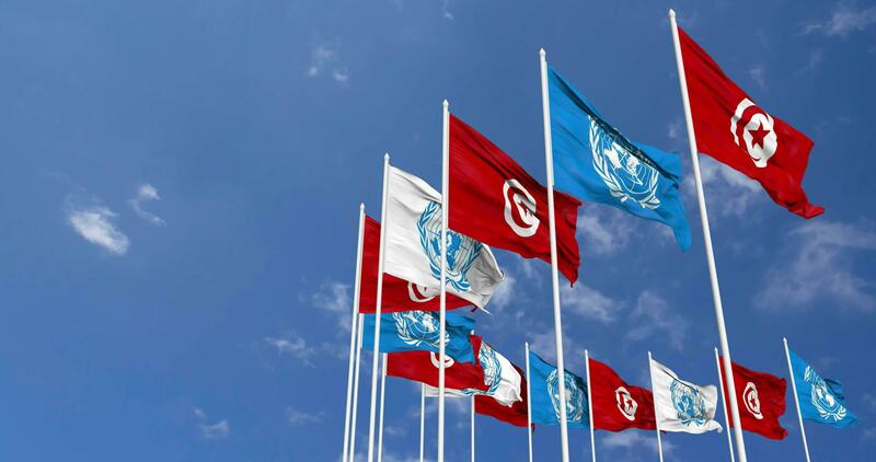 Tunisia and United Nations, UN Flags Waving Together in the Sky, Seamless Loop in Wind, Space on Left Side for Design or Information, 3D Rendering