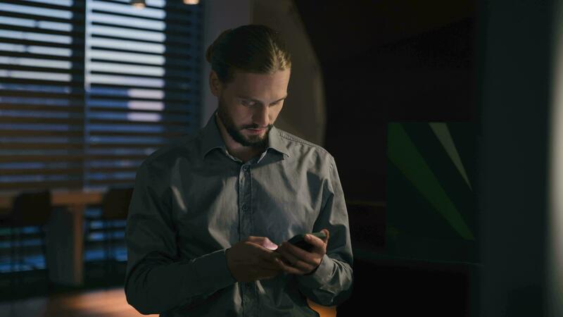 Carefree positive browsing phone mobile app Caucasian businessman at evening office using smartphone smiling happy business man entrepreneur scrolling cellphone check email work break message network Pro Video