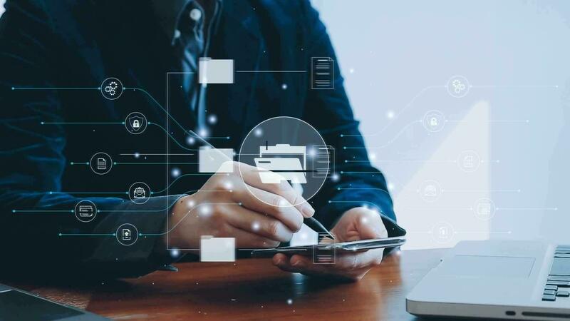 online document Document management system business process automation technology. businessman wroking with document icon on virtual screen. File storage and archiving. ERP. Folder structure. Free Video