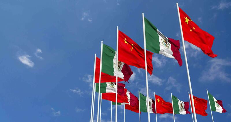 Mexico and China Flags Waving Together in the Sky, Seamless Loop in Wind, Space on Left Side for Design or Information, 3D Rendering Free Video