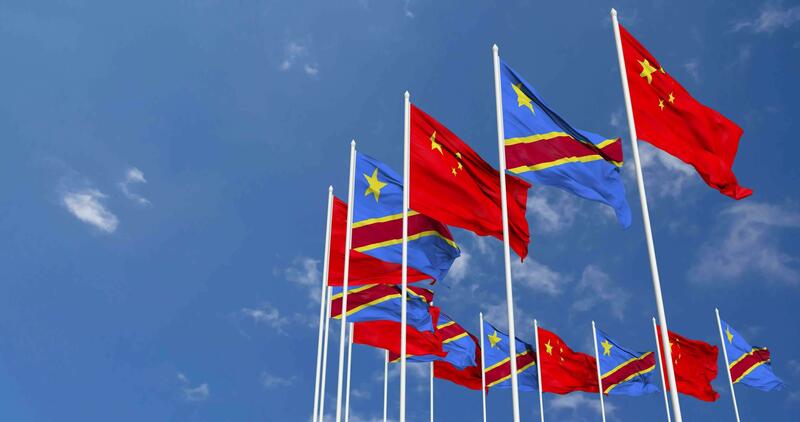 DR Congo and China Flags Waving Together in the Sky, Seamless Loop in Wind, Space on Left Side for Design or Information, 3D Rendering Free Video