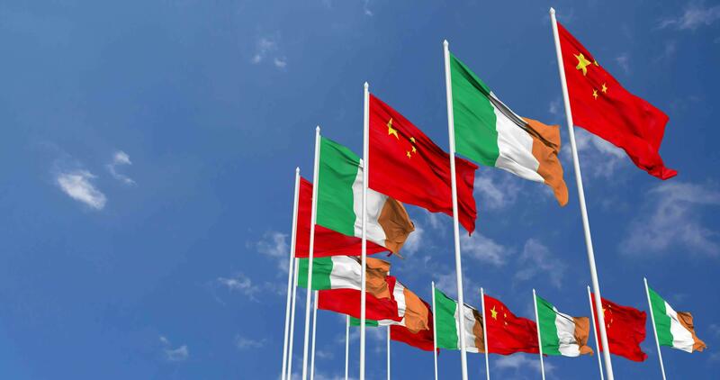 Ireland and China Flags Waving Together in the Sky, Seamless Loop in Wind, Space on Left Side for Design or Information, 3D Rendering Free Video
